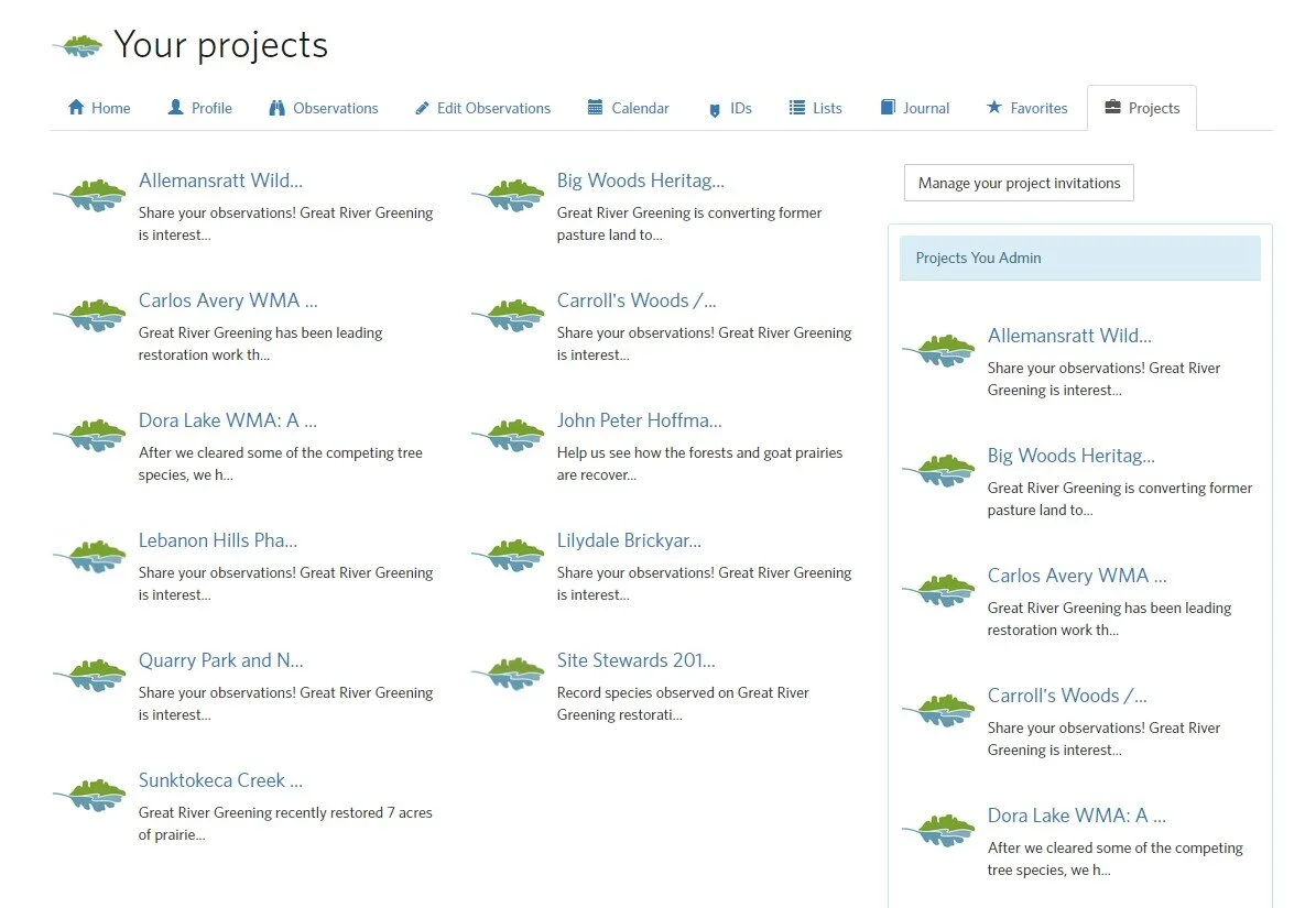 When you tag within a Great River Greening project site, you help with important restoration work. Projects, defined by park or boundary, are created to compile data specific to that location. This information establishes a baseline measure of biodiversity including before, during, and after the restoration process. Your contributions matter — they introduce, educate, and engage the public with our work and important natural areas.