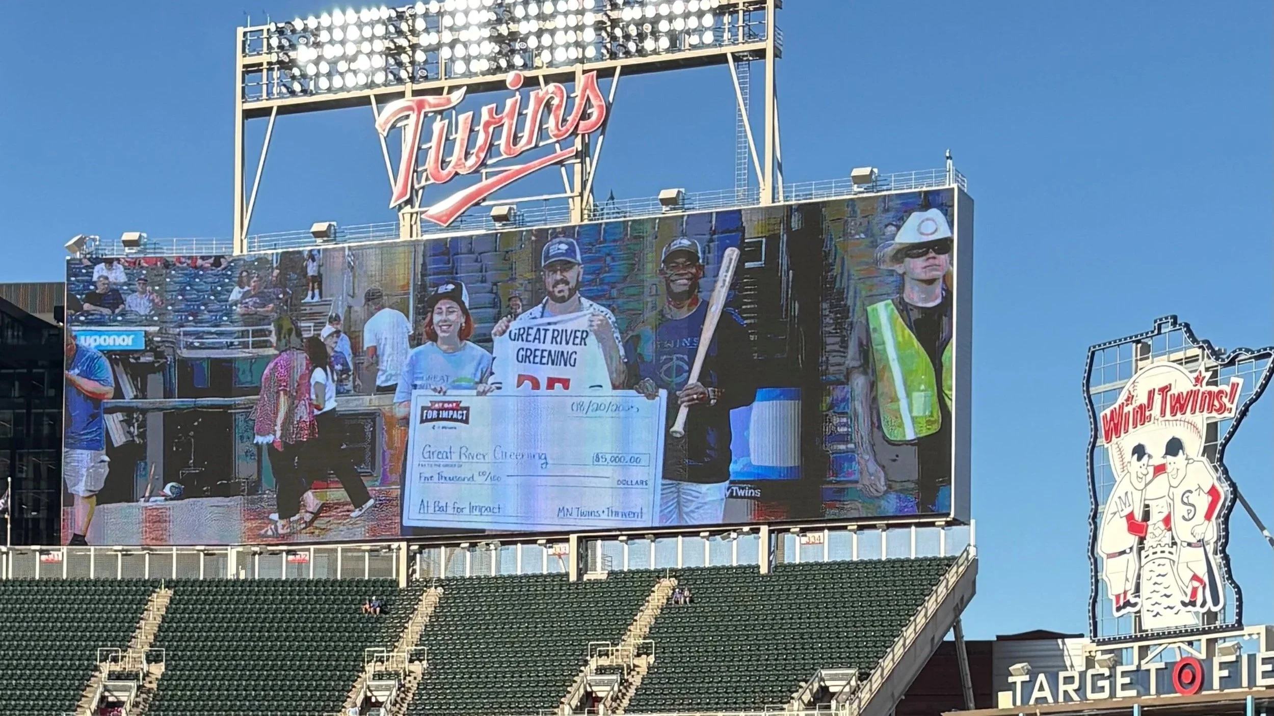 Photo: Board members accept a check for Great River Greening at a Twins game.